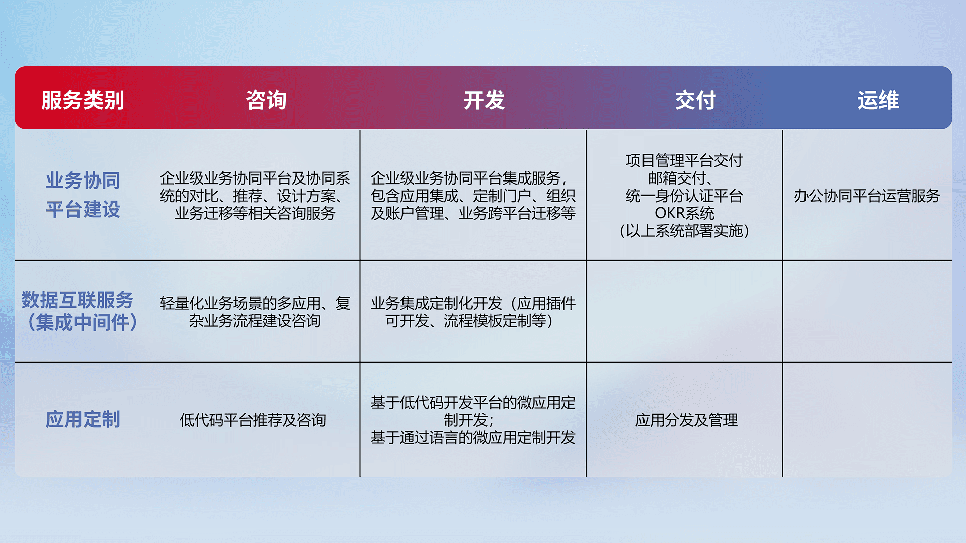 针对钉钉、、企微、、、IDaas等平台级产品提供产品的规划、、、、方案、、交付、、定制化开发等服务,,,实现如统一协同办公、、智能客户服务、、、、混合会议管理、、、、智能数据查询、、、等业务场景,,,实现数字化转型。。