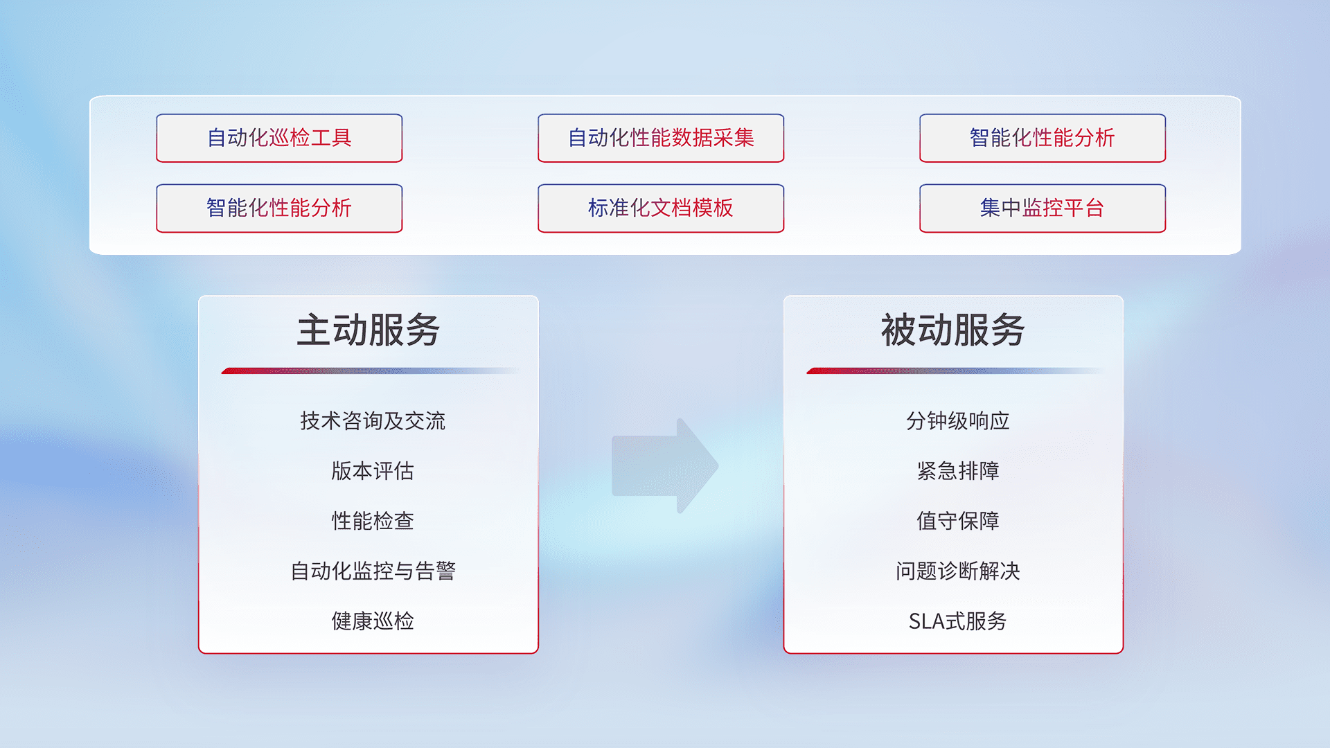 智能化工具和标准化文档,,,保障服务质量,,提供主动服务(包含技术咨询、、版本评估、、性能检查、、、自动化监控与告警、、、健康巡检)和被动服务包含(分钟级响应、、、紧急排障、、、、值守保障、、、、问题诊断解决、、SLA服务)。。。。